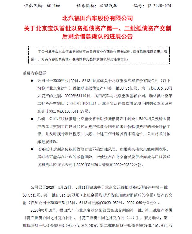 2020年6月12日,福田汽车公告,北京宝沃已于4月29日、5月31日向福田汽车交割完首批以资抵债资产中第一、二批资产,且两方于6月10日签署合同确认北京宝沃在借款协议项下的剩余本金及利息还有18.43亿元。